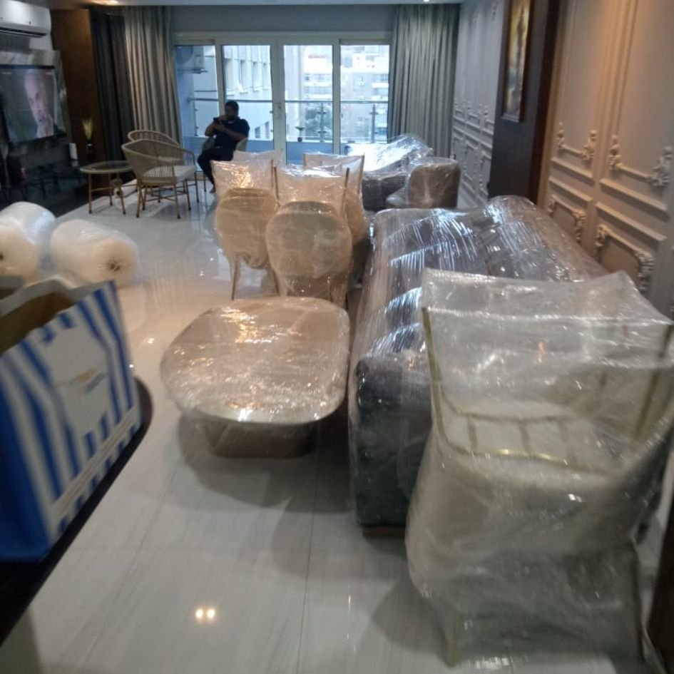 كل حاجة بتتغلف بالكامل قبل النقل – صالونات، سفرة، أجهزة كهربائية.